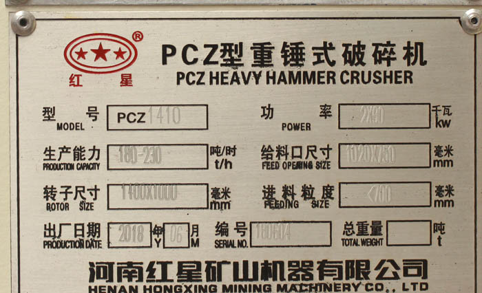 pcz型1410重锤破铭牌如上,可以看到功率,生产能力,给料口大小,进料大小,等参数